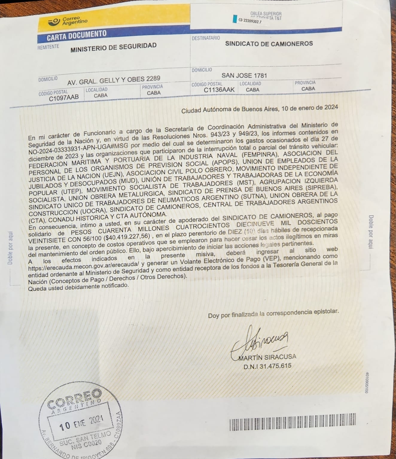 A través del Ministerio de Seguridad, el Gobierno Nacional intima a la CTA Autónoma, la Federación Nacional Territorial y la Asociación Trabajadores del Estado, CONADU Histórica, y organizaciones de otras centrales sindicales y movimientos sociales al pago de multas.